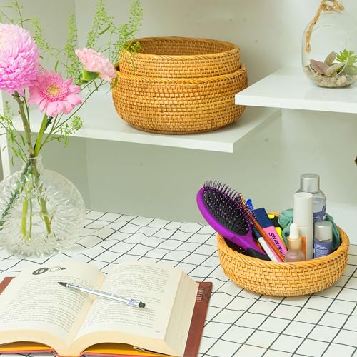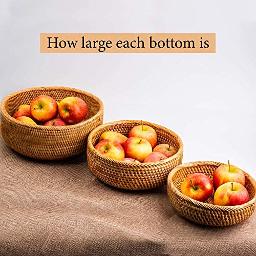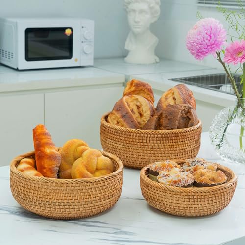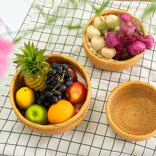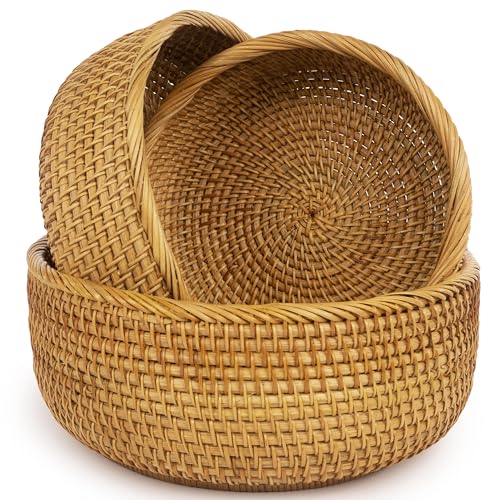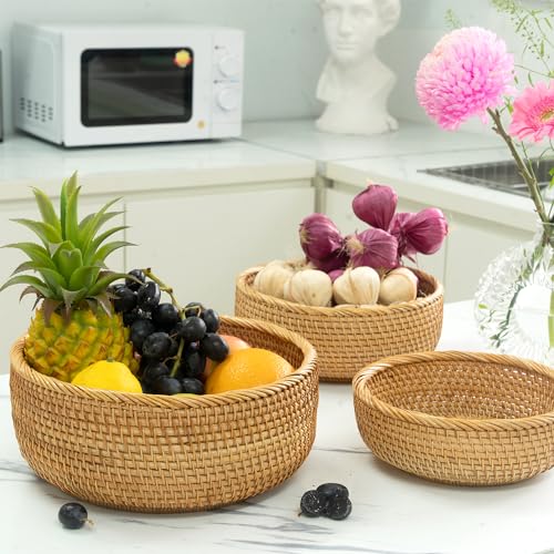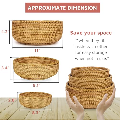 CLAYNIX Woven Fruit Basket For Holder Bowl Decorative Bread Vegetable, Serving Bowl Set of 3 For Organizing Kitchen Natural Rattan Picnic Basket Round Stackable (Natural)